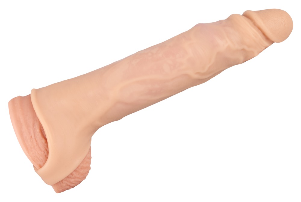 Fluweelzachte huls met opvallende eikel en adering. Ondersteunt het mannelijk uithoudingsvermogen en verlengt de penis met ongeveer 5 cm. De extra testikelopening zorgt voor extra steun en een aangenaam grijpgevoel.