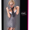 Nauwsluitende mini jurk met verstelbare bandjes en twee jarretels aan de voorkant. Aangezette knopen aan de voorkant en aangegeven kraag bij de diepe halslijn. Inclusief stropdas tot stropdas.