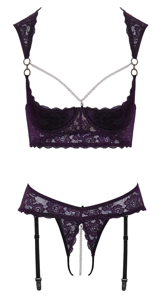 Longline shelf bra and a crotchless suspender thong combined in a set by Cottelli LINGERIE. Made of dark purple lace with black details, garnished with silver-coloured rings and white pearls. The underwire lift with lightly padded cups lifts the bosom perfectly. The pearl necklace framing the bust is detachable with its small snap hooks. Sophisticated straps with lace on the shoulder section and a small clasp at the neck. The straps and hook fastening are adjustable to fit at the back. The suspender thong seduces with a stimulating pearl chain in the open crotch, which is removable – just like the adjustable 6 suspenders.