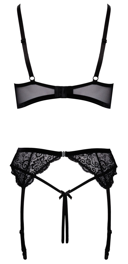 Shelf bra, suspender belt and crotchless thong combined in a set from Cottelli LINGERIE. All made from soft black stretch lace and decorated with silver-coloured rings and elegant velvet details. Decorated with chains and beads between the cups and front of the crotchless thong, all of which are removable. The lightly lined underwired cups show off the breasts in an exciting way. The straps and hook fastening at the back can be adjusted to fit. Waist suspender belt with adjustable suspender straps and hook fastener at the back. The small lace thong seduces with its completely open crotch and small bow over the bum.