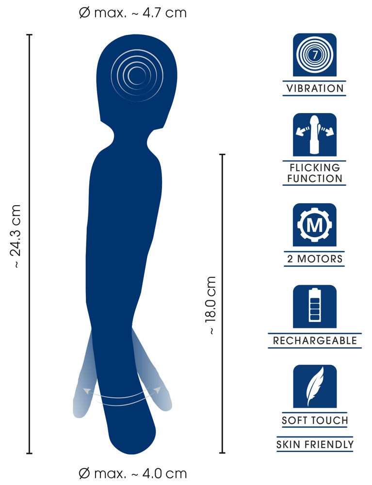 Totale lengte 24,3 cm, massagekop Ø 4,7 cm.