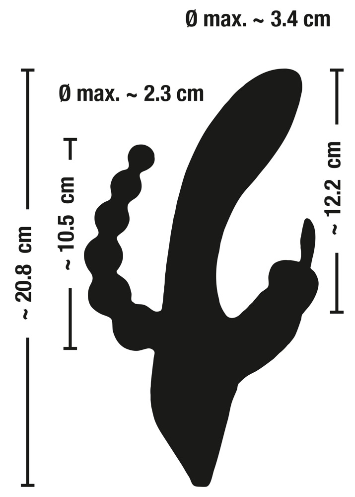 Totale lengte 20,8 cm; schacht: inbrenglengte 12,2 cm, Ø 2,4 cm tot 3,4 cm; anusstimulator: inbrenglengte max. 10,5 cm, Ø 0,6 cm tot 2,3 cm Gewicht 211 g. Silicone, PU, ABS.