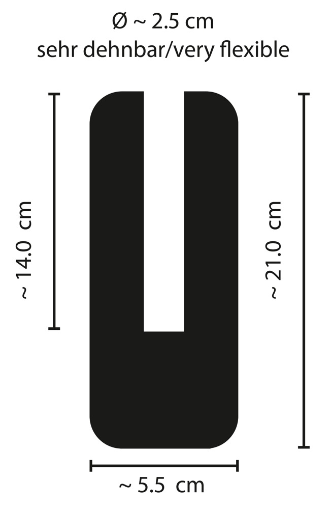 Totale lengte 21 cm, inbrengdiepte 14 cm, inwendige Ø 2,5 cm (rekbaar).