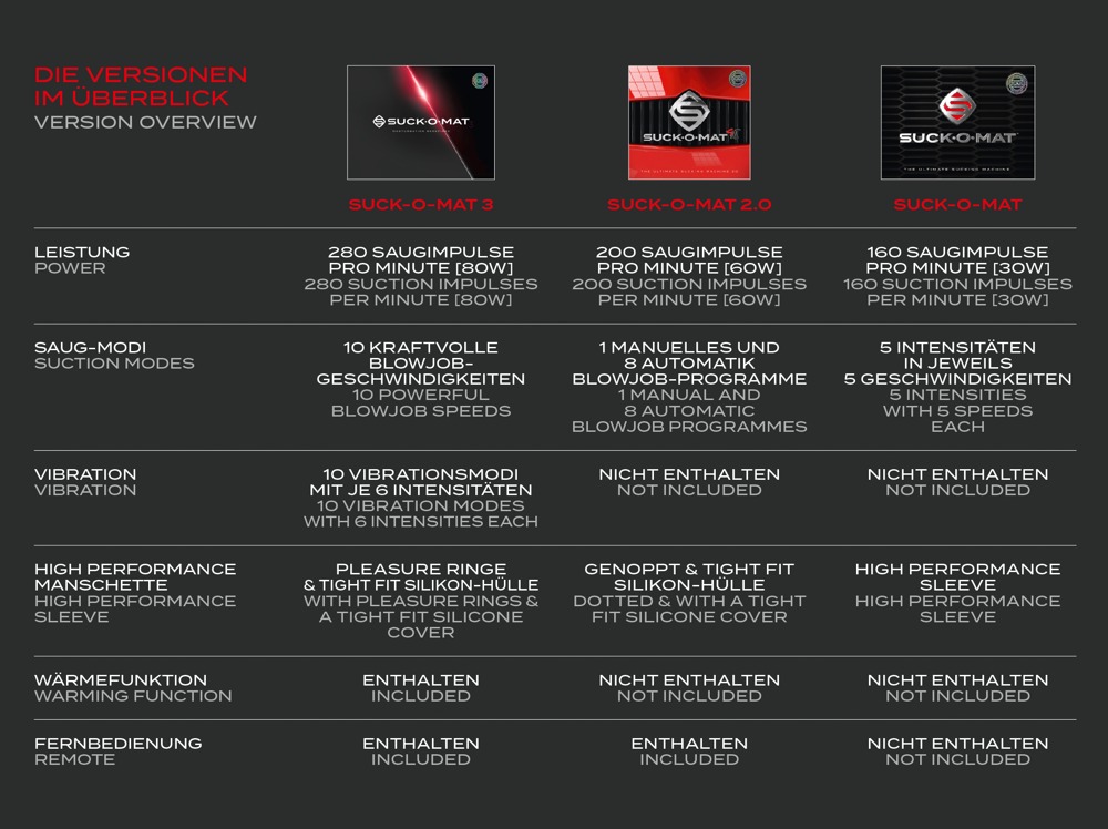 De krachtigere, stille technologie zit verborgen in het sportieve, elegante ontwerp. Een discrete rode LED-strip pulseert synchroon met de acties. Met maximaal 280 RPM van de geoptimaliseerde motor biedt de Suck-O-Mat 3 maar liefst 100% meer kracht dan zijn voorganger. De impuls zuigmassager wordt gevoed door elektriciteit (AC voedingsadapter 230V Euro Plug, output 12V. 12.5A, 150.OW) voor dit krachtige en betrouwbare continue plezier.