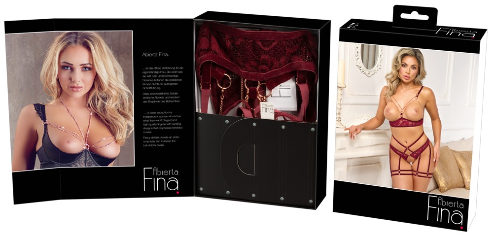 Opwindend setje van Abierta Fina met een bh zonder buste en een kruisloze jarretelslip. Fijn donkerrood kant verleidelijk afgezet met fluwelen linten en roségoudkleurige accessoires. Overal zacht en elastisch voor een hoog draagcomfort. Sieradenkettingen omlijsten de ontblote borsten, 3 afneembare kettingen in het volledig open kruis stimuleren bij elke beweging. De bh-bandjes en haakjessluiting op de rug kunnen op maat worden versteld. Jarretel-stijl slip met een taillehoge fluwelen tailleband. De fluwelen jarretelbandjes met dubbele dijbeenbandjes zijn op maat verstelbaar.