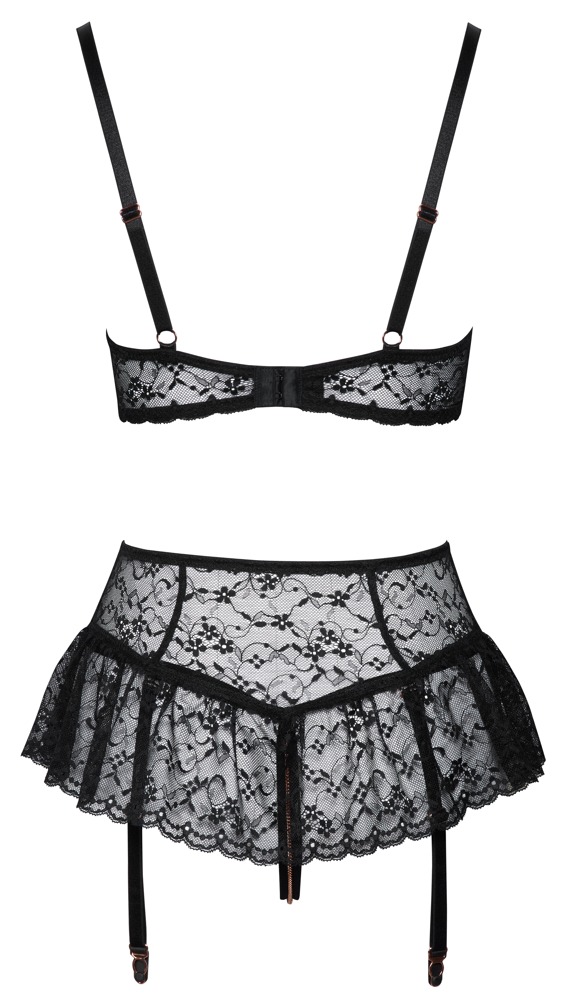 BH, jarretelrokje en kruisloze string van Abierta Fina. Alle drie de stukken zijn gemaakt van fijn, zacht, rekbaar kant in zwart met roségoudkleurige accessoires. Op te tillen met een juwelenhartje tussen de licht gewatteerde beugelcups. De kettingen in het decolleté kunnen ook worden verwijderd. De haaksluiting op de rug en de bandjes kunnen op maat worden versteld. Figuurcorrigerende jarretelrok met een haaksluiting versierd met glittersteentjes aan de voorkant. De verstelbare jarretelbandjes zijn ook volledig afneembaar. De string verleidt met zijn open kruis en stimulerende kruisketting, die ook kan worden verwijderd.