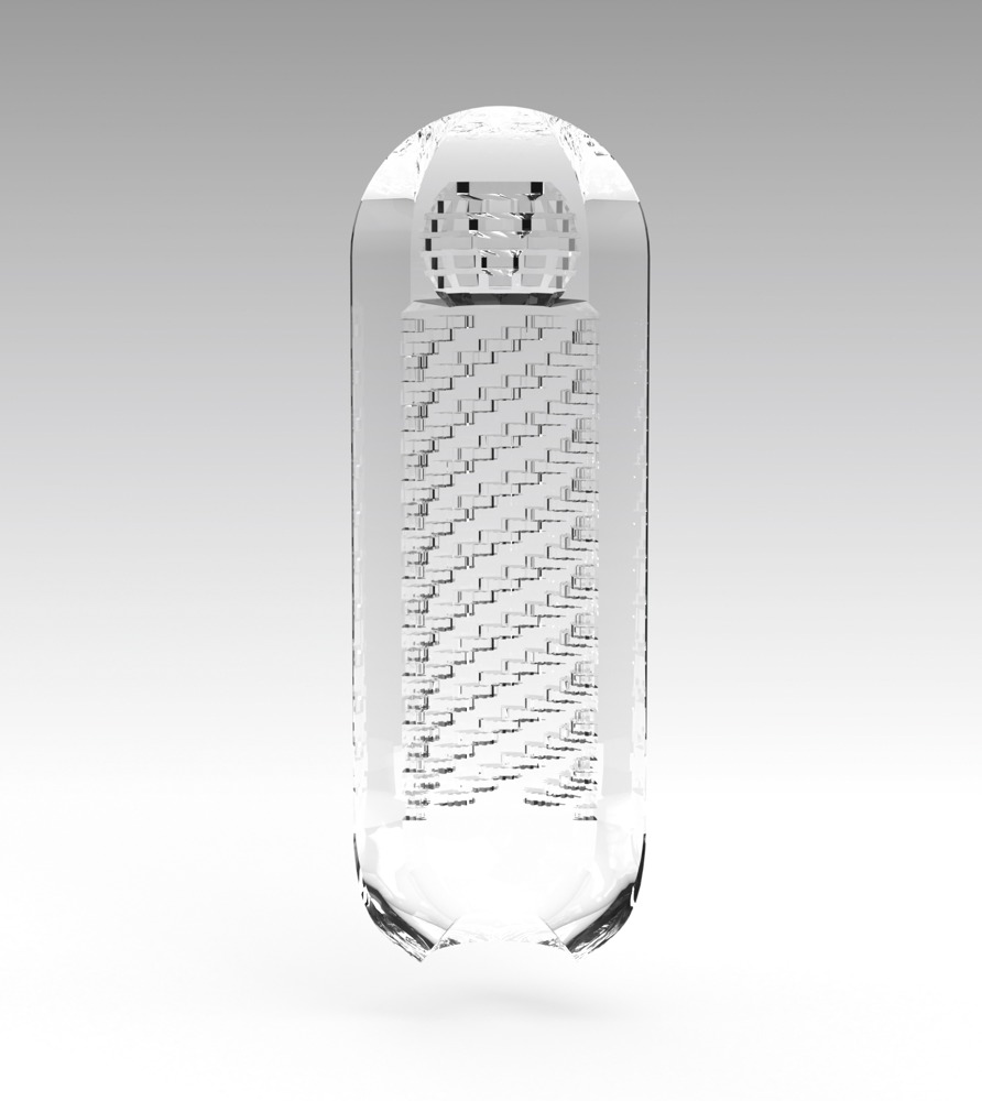 Transparante, herbruikbare masturbator spinner van TENGA met geïntegreerd spiraaltje dat de masturbator doet draaien wanneer hij gepenetreerd wordt (intern spiraaltje mechanisme). Onderscheidend stimulus-gestructureerd plezier kanaal.