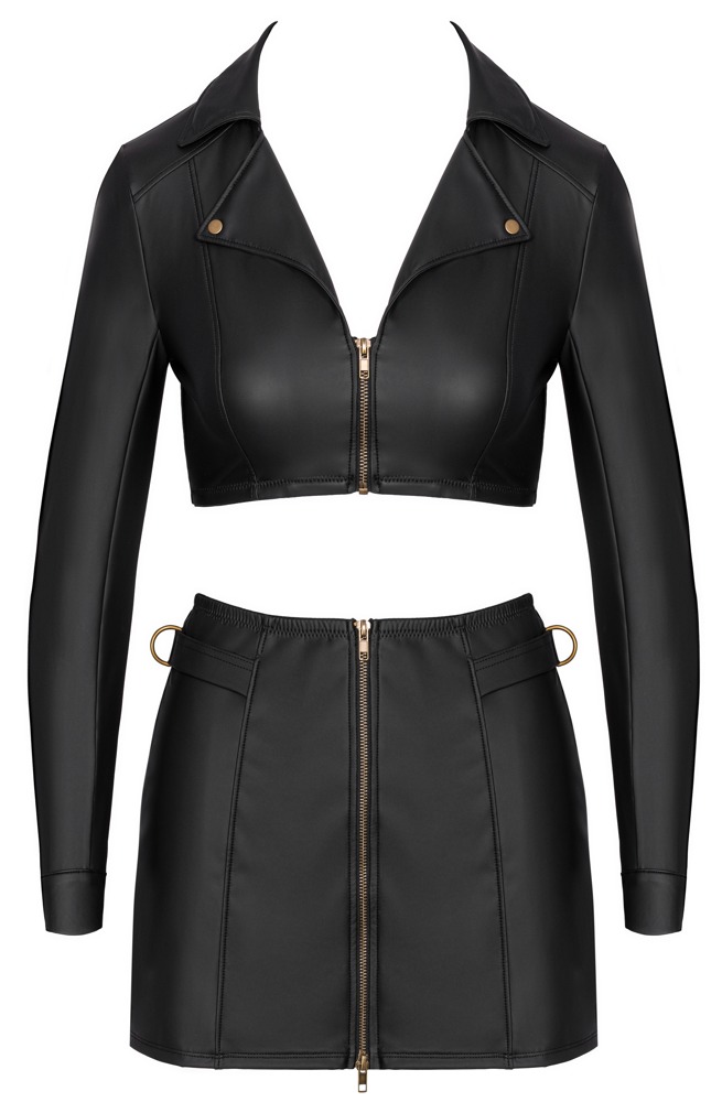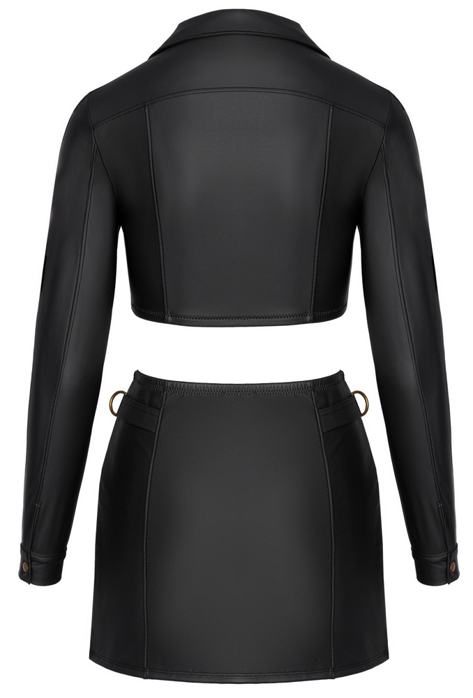 Clubwear set van Cottelli PARTY met een kort bovenstukje en minirok in een zwarte matte look met koperkleurige details. Overal zacht en elastisch voor een hoog draagcomfort. Buikvrije, nauwsluitende jasjestop met een korte doorlopende ritssluiting aan de voorkant. Decoratieve studs op de reverskraag en drukknopen op de manchetten. De slanke minirok heeft een doorlopende 2-weg ritssluiting aan de voorkant en ringen aan de zijkant van de elastische tailleband.