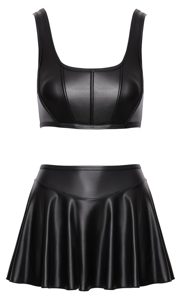 Korte korset top en mini rok set van Cottelli PARTY. In een trendy zwarte matte look - zacht en elastisch voor maximaal comfort. De crop top heeft voorgevormde baleinen voor een mooi silhouet. De haaksluiting op de rug is in 2 richtingen verstelbaar. De zwierige, uitlopende minirok heeft een mooie, elastische tailleband.