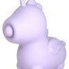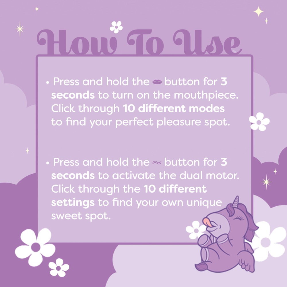 Schattige Karma Lilac lay-on vibrator van Unihorn in de vorm van een kleine eenhoorn. Het zachte, anti-slip siliconen speeltje verwent met veelzijdige vibraties en zijn intens kloppende massagesnuit. De luxe dubbele motor zorgt voor betrouwbare kracht. De 10 verschillende vibratie- en tikmassagestanden kunnen afzonderlijk worden bediend met één druk op de knop. Een magisch speeltje voor veelzijdig spel - alleen of met z'n tweeën - thuis of onderweg!