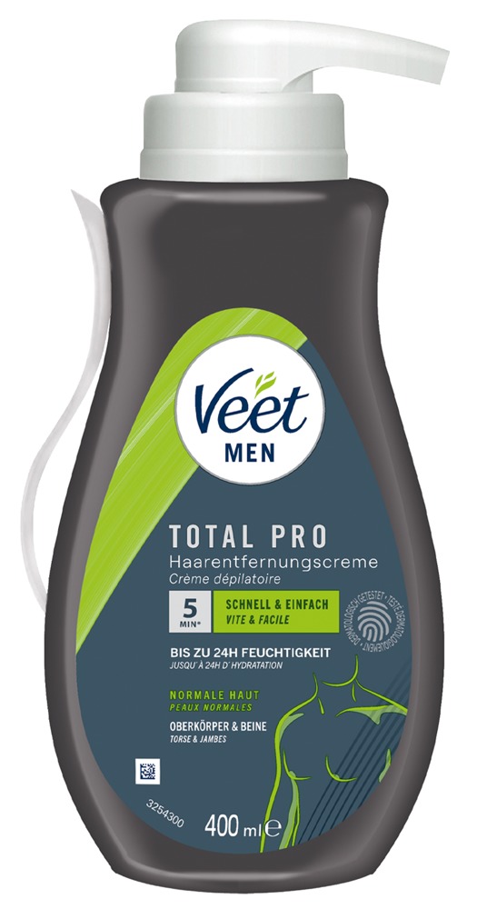 Met de Veet Men TOTAL PRO ontharingscrème verwijder je snel en effectief ongewenst haar op het bovenlichaam en de benen. De dermatologisch geteste formule zorgt voor een merkbaar gladde huid en hydrateert tot 24 uur lang. De crème verwijdert haar in slechts 5 tot 10 minuten voor langdurige resultaten met minder jeukende stoppels en minder ingegroeide haren in vergelijking met scheren. Na gebruik blijft er geen onaangename geur achter op de huid.