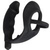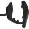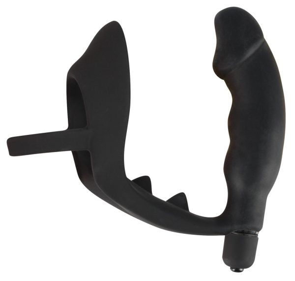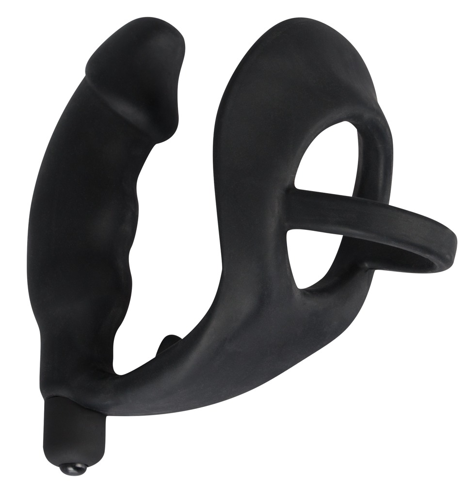 Deze zwarte penis/testikelring scoort niet alleen met extra anaalplug en charmant genopte perineum brug, maar vooral met een tintelende vibratie met een druk op de knop.