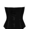 Provocerende bodysuit van Black Level volledig in zwarte lakglans met 4 verstelbare en afneembare jarretels. De open voorkant wordt gesloten met 3 gespen en de halsband halster met één gesp. In het kruis met 2-weg ritssluiting te openen.