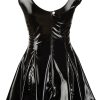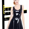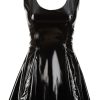 Korte, mouwloze jurk van Black Level volledig in zwarte lakglans met diepe halsuitsnijding voor- en achteraan. Nauw aansluitend op het figuur met een uitlopende rok. Met geïntegreerde ritssluiting aan de achterkant.