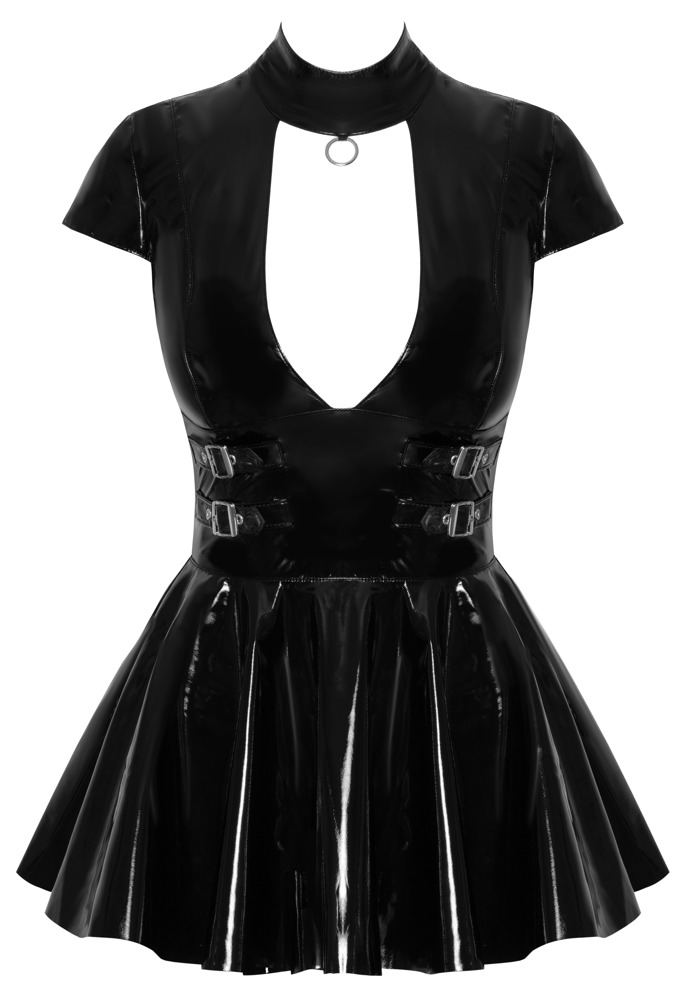 Mini-jurk van Black Level volledig in zwarte lakglans. In een aansluitend, getailleerd model met uitlopende rok. Met korte mouwen en een strenge opstaande kraag met een (bondage)ring aan de voorkant. Daaronder een grote uitsnede in de halslijn. Met 2 verstelbare riempjes met gespen aan de zijkanten van de taille. Een rits over de hele lengte aan de achterkant.