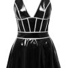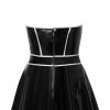 Short halterneck dress from Black Level in black vinyl with silver-coloured decorative seams in a waisted bodice look. Off-the-shoulder and backless, tight-fitting top with a plunging neckline and wide flared skirt. Halterneck with press stud fastening. Back with press stud and zip fastening.