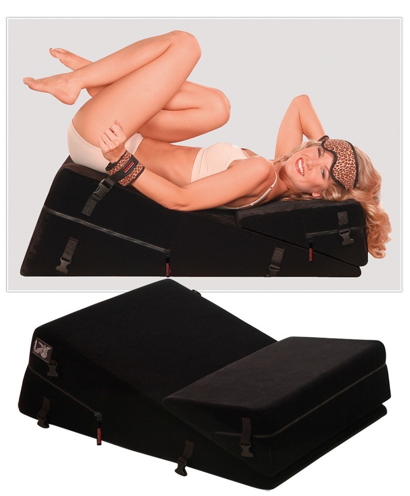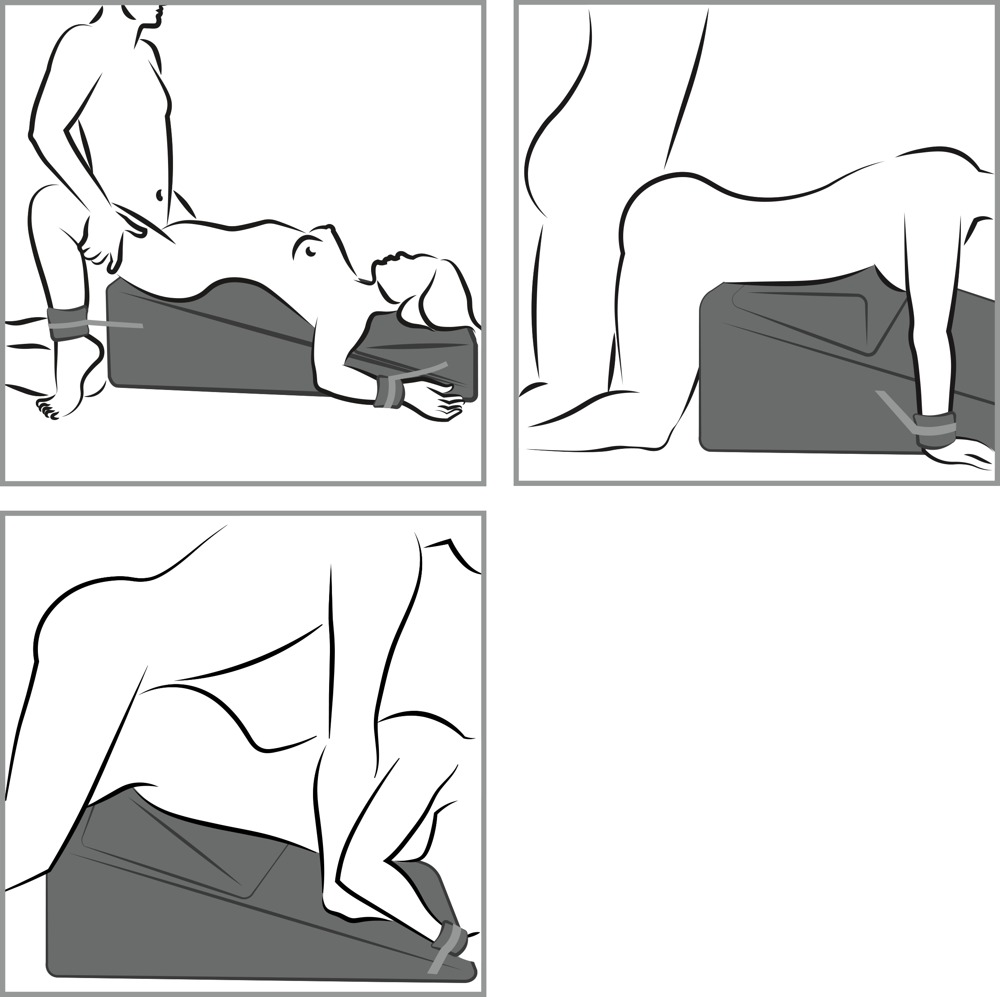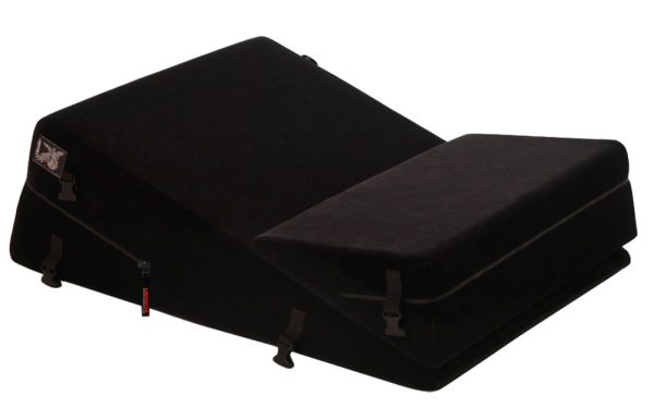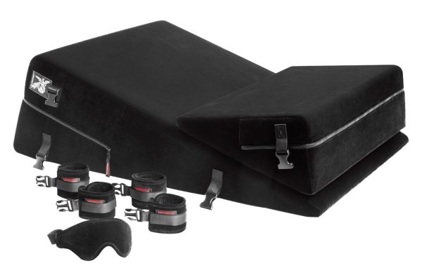 2 anatomisch gevormde liefdeswigkussens Wedge/Ramp Combo van Liberator plus 4 afneembare en verstelbare hand- en voetboeien en een oogmasker inbegrepen. De zachte microvezel hoezen van de kussens kleven aan elkaar en kunnen worden verwijderd van de vochtbestendige body om schoon te maken.