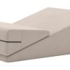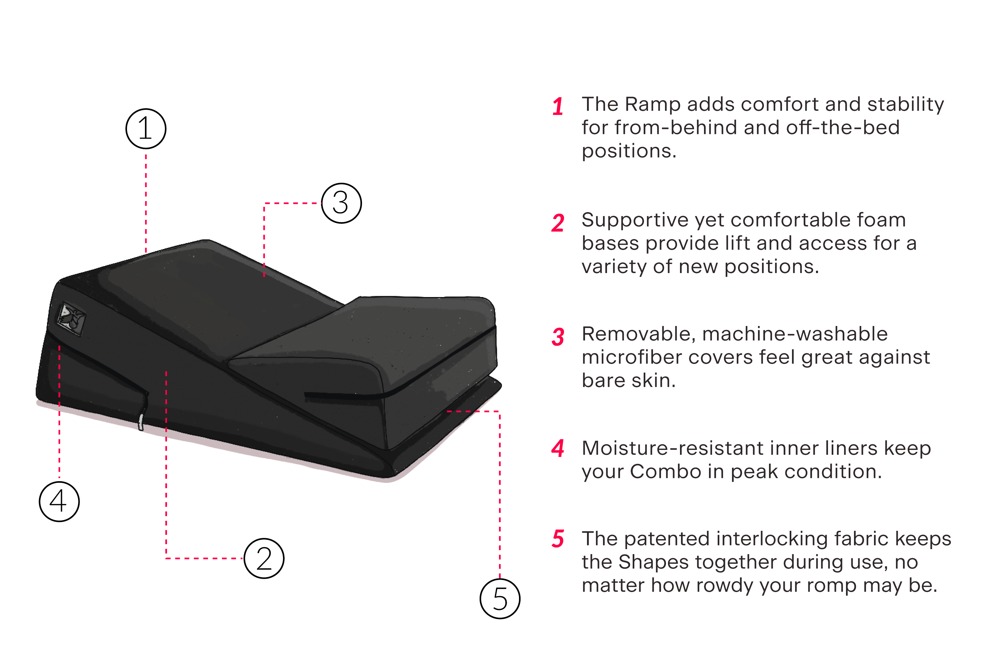 2 verschillende maten, ergonomisch wigvormige liefdeskussens in de Wedge/Ramp Combo set van Liberator. Met zachte microvezel hoezen die aan elkaar kleven zonder te verschuiven. Dit betekent dat het kleine wigkussen afzonderlijk op het grote wigkussen kan worden gelegd. Beide kussens kunnen natuurlijk ook afzonderlijk worden gebruikt. De twee stevige wigkussens zijn de perfecte en comfortabele ondersteuning voor seksposities en orale spelletjes.