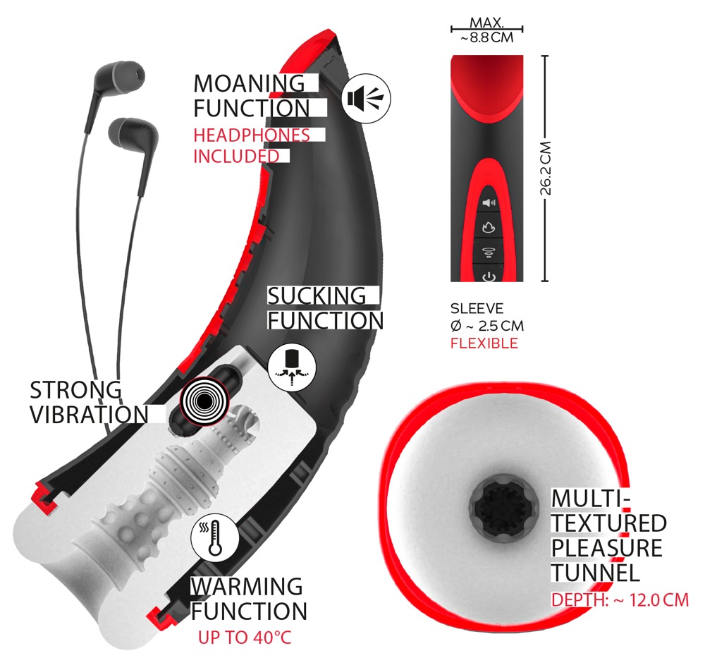 Krachtige masturbator 03 van WYNE die de penis volautomatisch intensief verwent met 7 vibratie- en 3 zuigstanden. Plus een warmtefunctie tot 40°C en sexy ademend gekreun (3 geluiden) via de bijgeleverde hoofdtelefoon om je in de stemming te brengen. Alle functies kunnen afzonderlijk en comfortabel worden bediend met een druk op de knop direct op het handige speelgoed.
