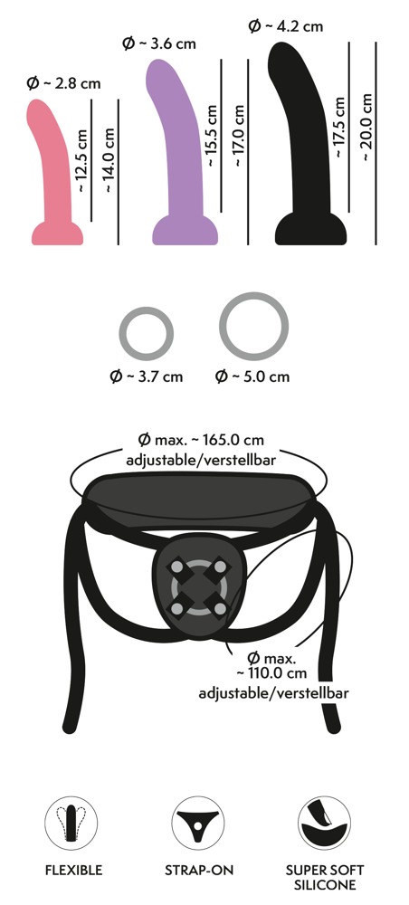4-delige set uit de Your Strap-on Collection van You2Toys met harnas en 3 verschillende maten dildo's (S, M, L). Elke zuignap dildo kan snel en eenvoudig in het in maat verstelbare strap-on harnas worden geschoven en worden vervangen. En kan natuurlijk ook solo gebruikt worden. Een gevarieerde set voor veelzijdig plezier - alleen en met z'n tweeën!