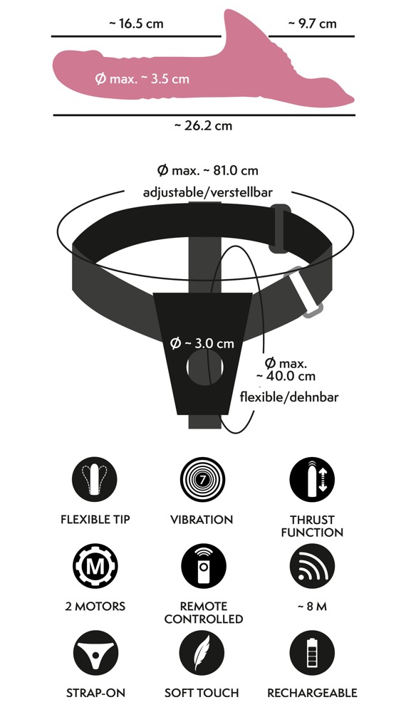 De geavanceerde vibrator scoort met zijn vibraties met dubbele motor die de actieve en passieve delen tegelijkertijd verwennen. Hij heeft ook een automatische stuwfunctie die het voorbindplezier krachtig en diep ondersteunt. Het actieve deel geniet van de anatomisch perfect gevormde sleeve, die tegen de vulva en clitoris vibreert. Het passieve deel geniet van de vibrator schacht met zijn gestructureerde eikel en stimulerende groeven die keer op keer stoot. 7 vibratiestanden en 3 stootintensiteiten kunnen direct op het speeltje worden bediend of - nog handiger - apart met de afstandsbediening (bereik 8 meter). De schokvibrator kan eenvoudig worden verwijderd van de strap-on string.